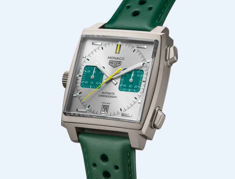 ساعة TAG Heuer Monaco Chronograph Racing Green مزودة بحزام أخضر مثقب، لتتناسب مع المظهر الكلاسيكي للرجل البريطاني. الحزام مؤمن بمشبك قابل للطي من التيتانيوم، يحمل شعار Heuer. وهي تأتي بإصدار محدود، يحمل ظهرها نقش “ONE OF 1000”. وهي متوفرة في علبة سوداء مصممة خصيصًا مع تفاصيل صفراء زاهية. إنها الساعة المثالية للسائق المثالي.