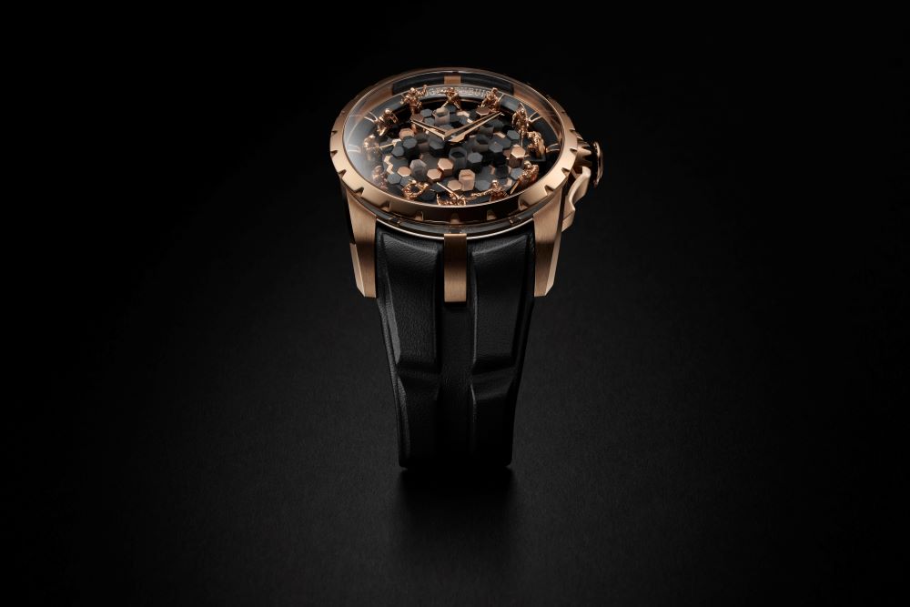 يتميز التاج الموجود على الهيكل مقاس 45 ملم، المصنوع من الذهب الوردي، والمُصمّم على شكل حارس يحمل سيفاً. إنه يرمُز إلى قصة سحر ميرلين عندما ساعد آرثر على سحب النصل الأسطوري من الحجر للتعبير عن مصيره باعتباره ملكاً حقيقياً. وبالمثل، فإن الوزن المُتأرجح بزاوية 360 درجة على الجزء الخلفي للهيكل مُستوحى من نوافذ الزجاج الملون لقلاع العصور الوسطى. يُعد هذا العنصر الجذّاب مثالاً على خبرة روجيه دوبوي المُتقدِّمة في التصميم المُهيكل. وبالرغم من أنه أخف وزناً وأصغر حجماً من الكتلة المُتأرجحة النموذجية، لا يزال يتميّز بتصميم مثالي، ما يُثبتْ أن البراعة الجمالية والأداء الخالي من العيوب يمكن أن يجتمعا دائماً في تناغُم جذّاب. تلتف الساعة حول المعصم، ويكتمل جمالها بفضل حزام مصنوع من جلد العجل باللون الأسود ومشبك قابل للطي من الذهب الوردي ونظام فتح سريع عصري.
