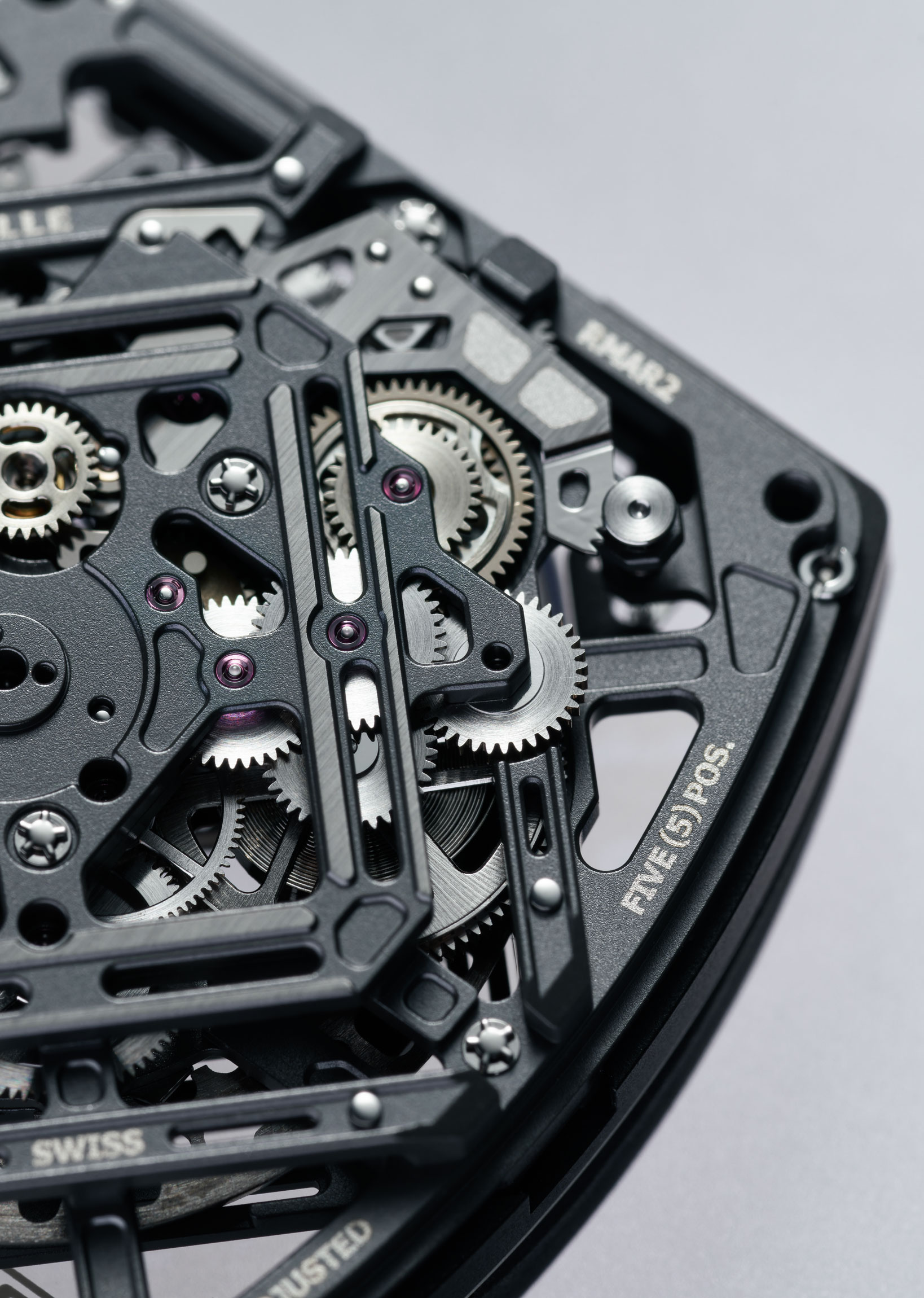 بداخل الساعة ينبض كاليبر RMAR2، نظام ميكانيكي متقدّم يتمتع بوظائف متعددة: عرض التاريخ بالحجم الكبير، مؤشر احتياطي الطاقة، محدد الوظائف، ودوّار قابل للفكّ. تصميم الساعة يعتمد على قاعدة من التيتانيوم صنف 5، اختُبرت بدقة لضمان مقاومة استثنائية وخفة عالية.
