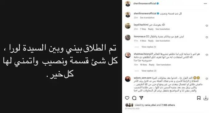 فاجأ الفنان شريف منير متابعيه على انستغرام بإعلان انفصاله عن الفنانة لورا عماد بشكل رسمي، حيث كتب: “تم الطلاق بيني وبين السيدة لورا، كل شيء قسمة ونصيب وأتمنى لها كل خير”.