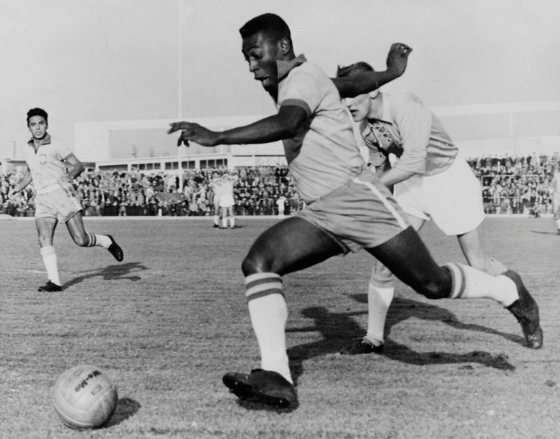 سطع نجم بيليه في سن مبكرة، إذ لعب أول مباراة مع نادي سانتوس بسن الـ15 في عام 1956، ومع تسجيله نحو 100 هدف بعد ذلك انضمّ للمنتخب البرازيلي في مونديال السويد 1958، وشارك حينها في الدور ربع النهائي حيث سجل في مرمى ويلز الهدف الأول للبرازيل، وأقصى فرنسا بالنصف النهائي من خلال تسجيله 3 أهداف، وسجل هدفين في النهائي الذي انتهى لفوز البرازيل على السويد بنتيجة 5- 2.